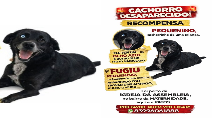 Quem tiver qualquer informação, entrar em contato com as tutoras Professora Giselle, Ana Beatriz ou Akemi pelos telefones: (83) 99606-1888/(83) 99994-0901. A família está desesperada e oferecendo uma boa recompensa.