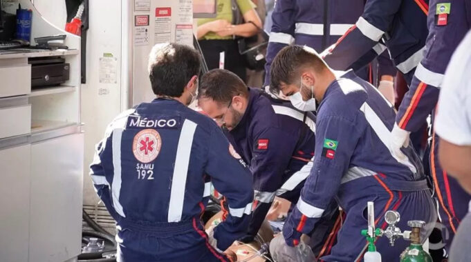 Imagens feitas por populares mostram o homem caído no chão, enquanto pessoas tentam ajudar e acionam o Serviço de Atendimento Móvel de Urgência (Samu).
