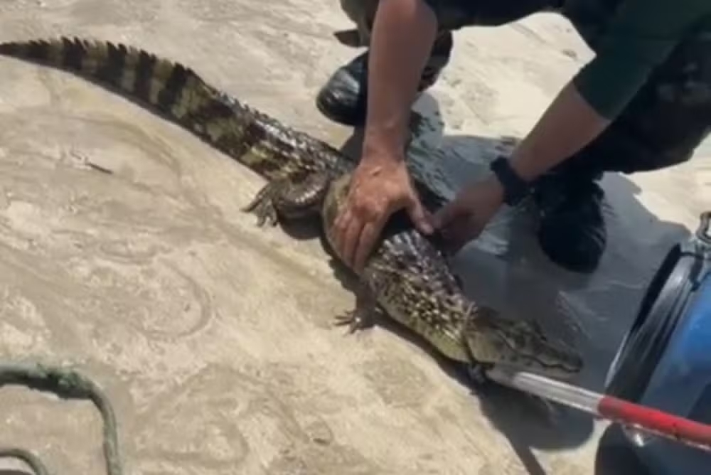 Um filhote de jacaré foi encontrado na manhã deste domingo (8) na faixa de areia da praia de Areia Dourada, em Cabedelo. O animal foi visto por banhistas que estavam no local e capturado pela Guarda Metropolitana de Cabedelo.