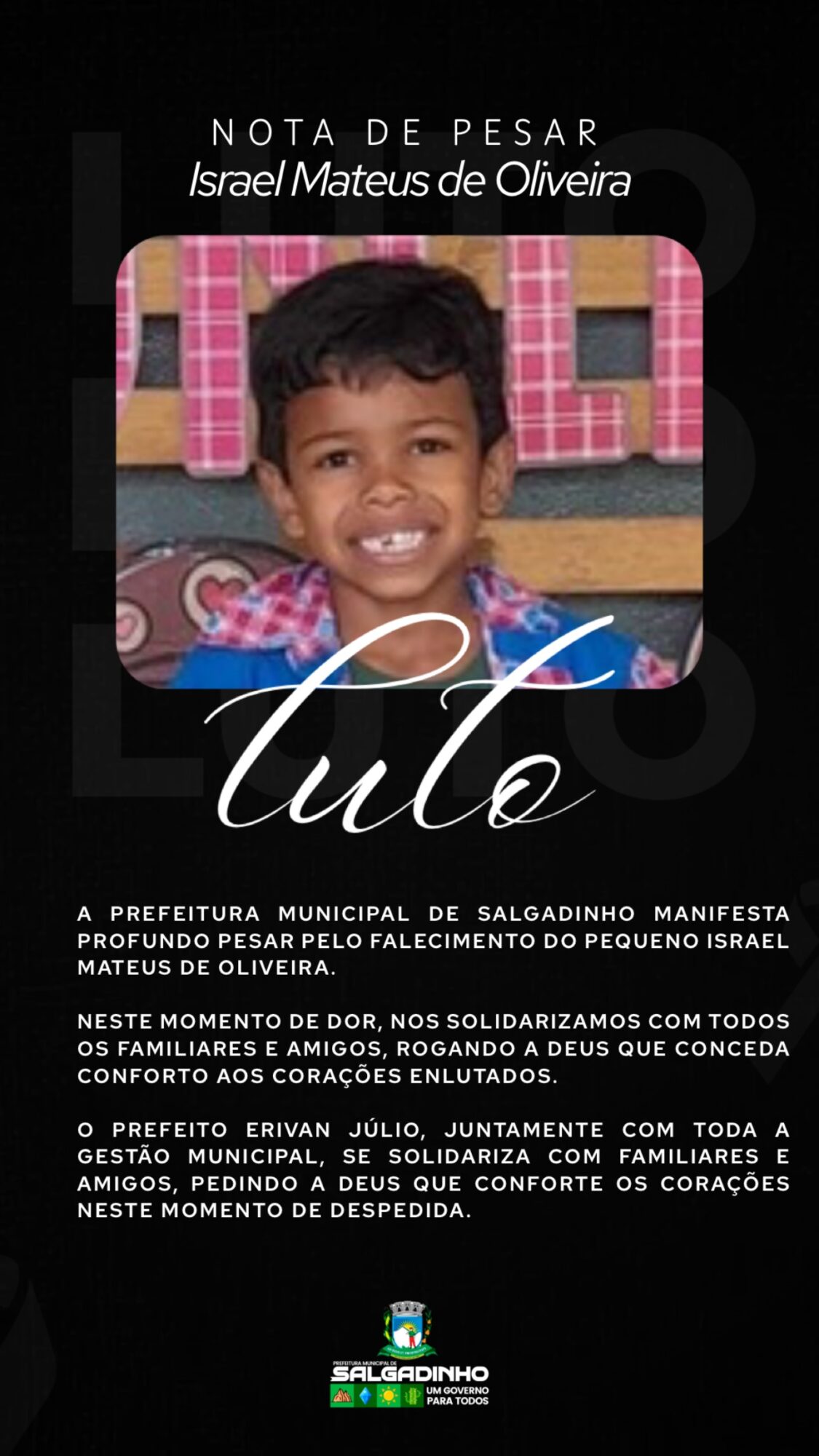 A Prefeitura Municipal de Salgadinho divulgou uma nota de pesar lamentando a morte do menino.