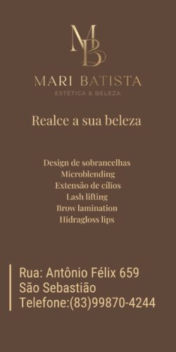 O seu espaço Mari Batista Estética e Beleza, terá um atendimento focado em realçar a beleza natural de cada pessoa, além de oferecer um espaço acolhedor, buscando fazer com que cada pessoa se sinta valorizada e saia ainda mais confiante para enfrentar os desafios da vida. O Whatsapp para contatos é o (83) 998704244.