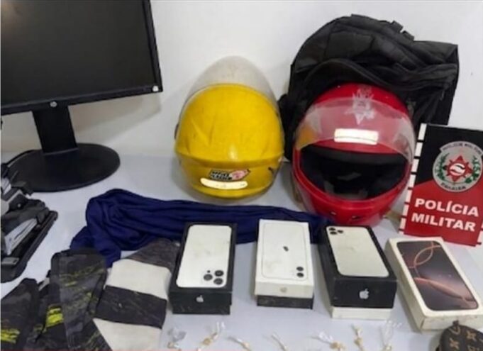 Na continuidade das diligências, os policiais localizaram 39 porções de substância análoga ao crack, além de capacetes utilizados no assalto e caixas de celulares, que estavam escondidas em um imóvel vizinho. Os suspeitos confirmaram a participação no roubo.