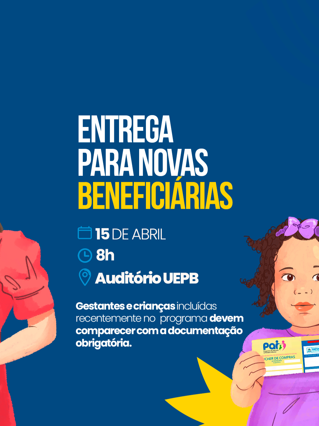 A entrega para novas beneficiárias acontecerá no dia 15 de abril, no Auditório da UEPB, a partir das 8h. Já as demais entregas serão realizadas nos Centros de Referência de Assistência Social (CRAS), conforme cronograma: