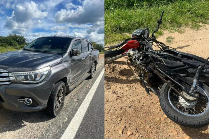 Uma forte colisão envolvendo uma motocicleta Honda Pop 110i, de cor vermelha, e uma caminhonete Toyota Hilux cinza foi registrada no início da tarde deste domingo, 26 de abril, na BR-361, no trecho do Sítio São José, nas proximidades da entrada do Sítio Urtiga, entre os municípios de Patos e Santa Terezinha.