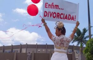O "Enfim... Divorciada!" escrito no cartaz que a empresária Carol Dourado segurou após assinar os documentos do divórcio com o ex-marido, em frente ao...