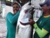 Homem pesca peixe de 2 metros de comprimento e 70 kg,...