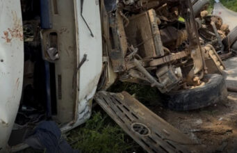 Caminhão com três pessoas capota após pneu estourar entre Juru e Água Branca